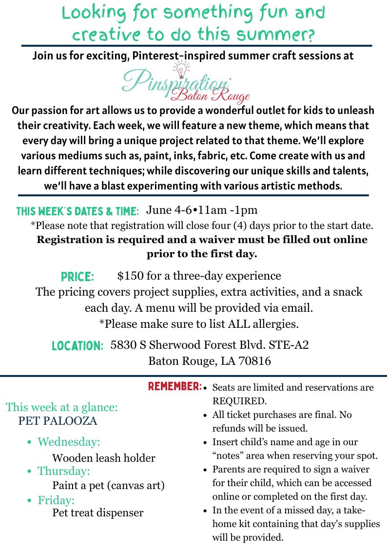 Sibling discount available. For more information email: BatonRouge@pinspiration.com
